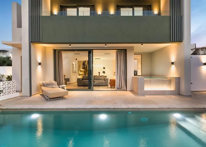 Lux Sea View Villa By Chania Living Stories med 3 sovrum, som har en uteplats med utsikt över poolen, ligger 15 minuters bilresa från flygplatsen Kreta Chania. Villan med 3 badrum har utomhuspool och terrass, medan Mitropoleos torg ligger ungefär 10 minuter bort med bil.